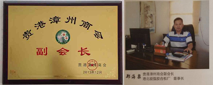 鄭海泉,男,漢族,籍貫:福建漳州市龍文區(qū),現(xiàn)擔(dān)任廣西貴港市漳州商會副會長,貴州銅仁地區(qū)福建商會常任理事長,于1987年高中畢業(yè),1988年-1998年從事運(yùn)輸行業(yè),于1999年在漳州創(chuàng)辦宏晨發(fā)膠合板廠,2006年在貴州銅仁市玉屏縣創(chuàng)辦宏晨發(fā)膠合板廠(企業(yè)榮獲愛心先進(jìn)企業(yè),貴州銅仁地區(qū)福建商會先進(jìn)會員企業(yè)),2007年在四川廣漢創(chuàng)辦宏晨發(fā)膠合板廠,2011年在貴州凱里創(chuàng)辦宏晨發(fā)膠合板廠,2012年在廣西貴港市創(chuàng)辦能強(qiáng)木業(yè)有限公司,現(xiàn)任董事長。